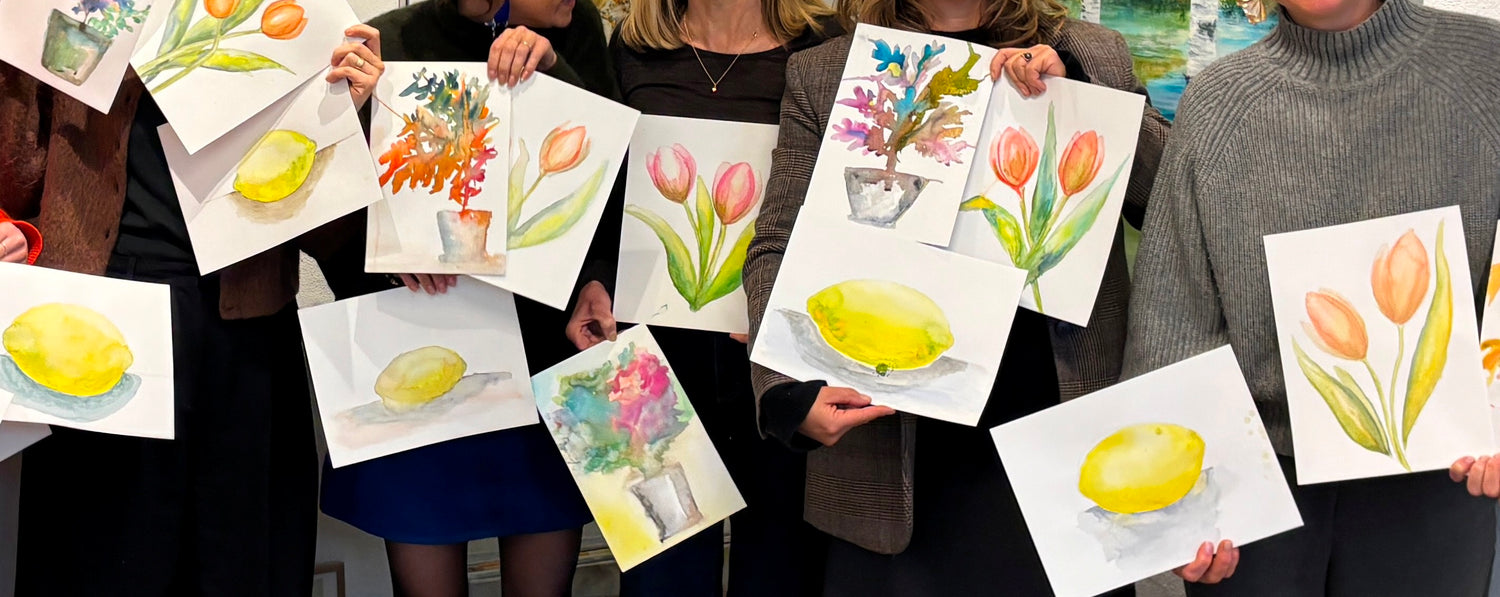 Kom nemt fra start med akvarelmaling for begyndere eller et kunstforløb i akvarel, tegning eller maleri. Du kan også finde onlinekurser på video der kan tages derhjemme - når som helst. Book en privat workshop med familien som event i København. '